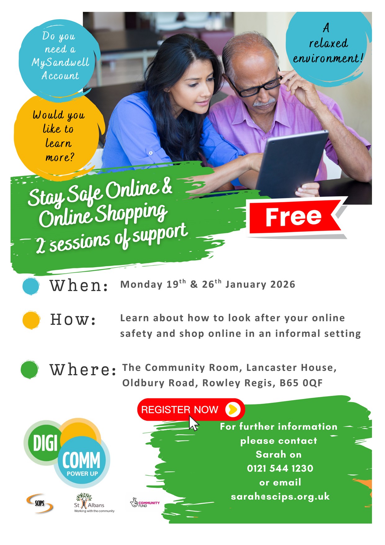 ‘Stay safe online & online shopping’ (Learn how to look after your online safety and shop online in an informal setting) – Taking place on Monday 19th & Monday 26th January 2026, Interested? Then contact Sarah on 0121 544 1230 or email sarah@scips.org.uk to find out more or follow the link.